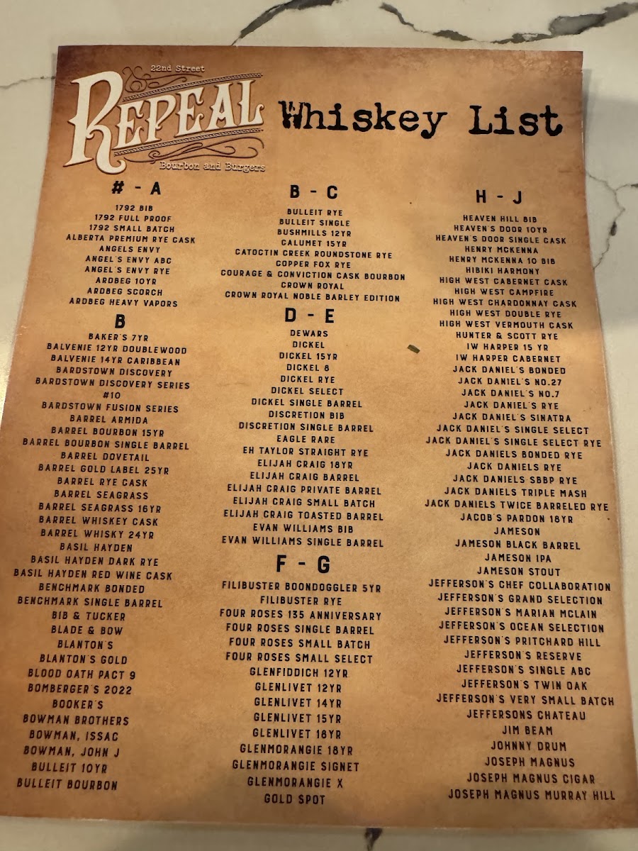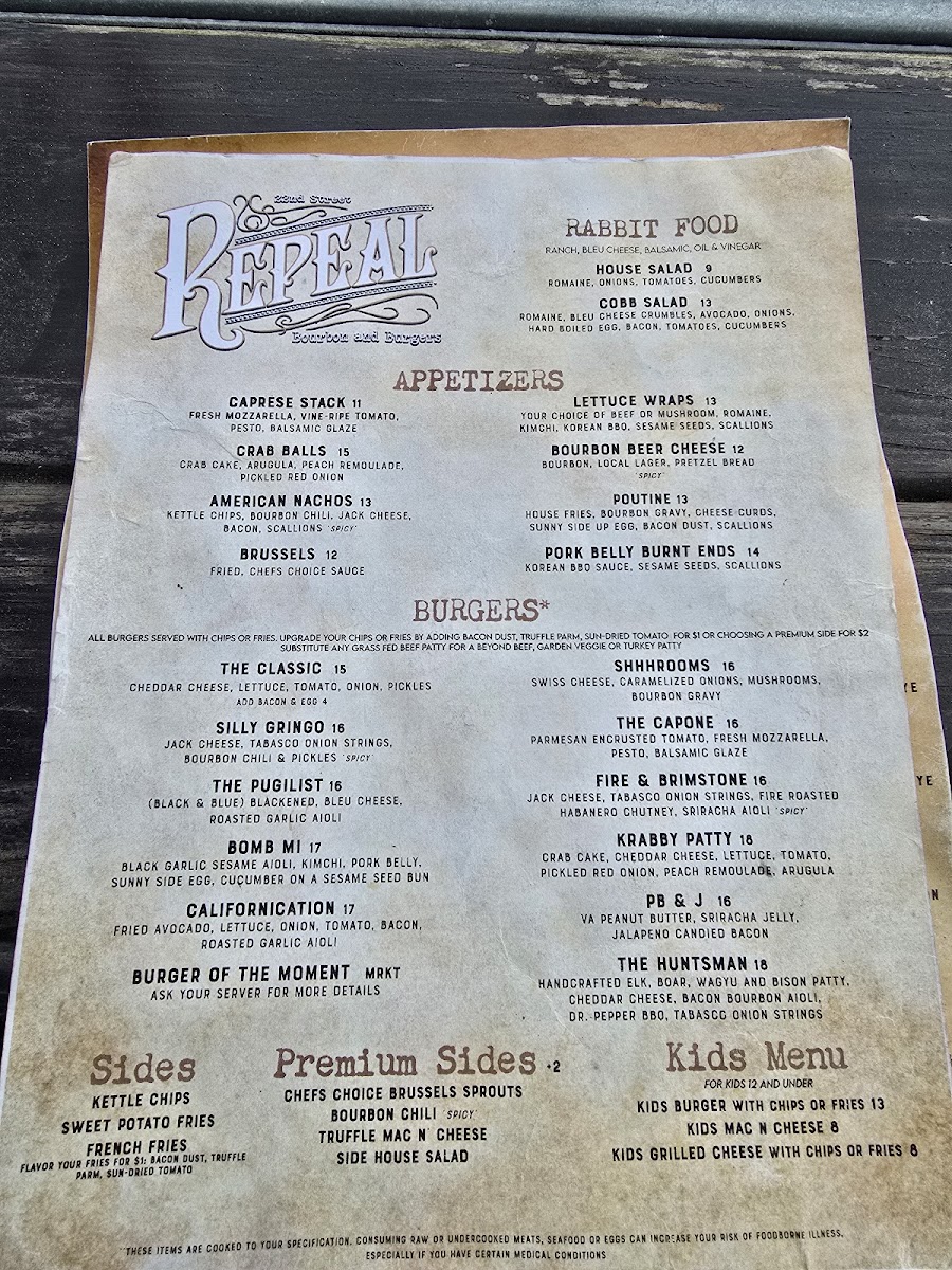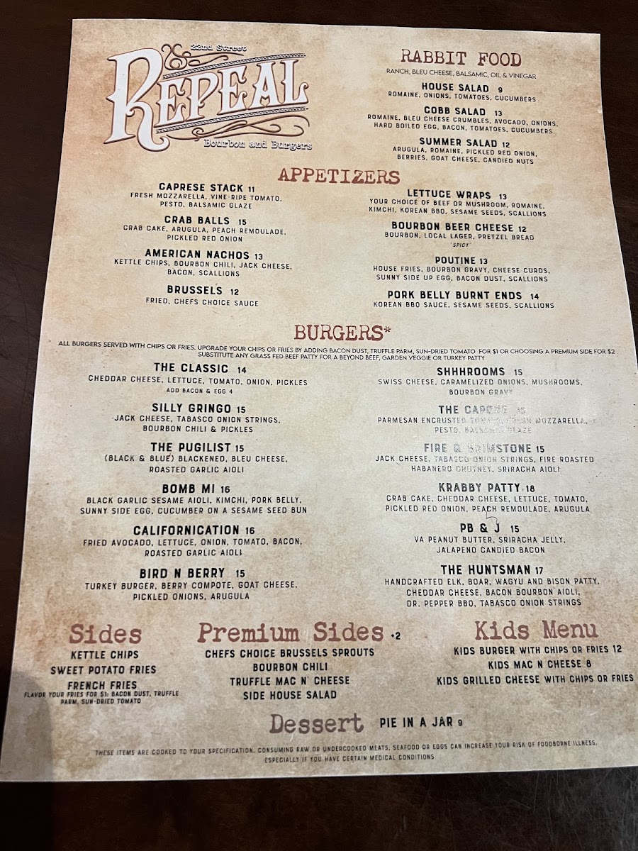 Right in the heart of Virginia Beach at 202 22nd St, the Repeal Bourbon & Burgers Menu reads like a love letter to comfort food with a serious bourbon obsession. The first thing that jumps out is the lineup of handcrafted burgers - thick, juicy patties stacked with bold toppings that don’t hold back. From smoky bacon and sharp cheddar to rich house sauces with just the right kick, every bite feels thoughtfully built rather than thrown together.